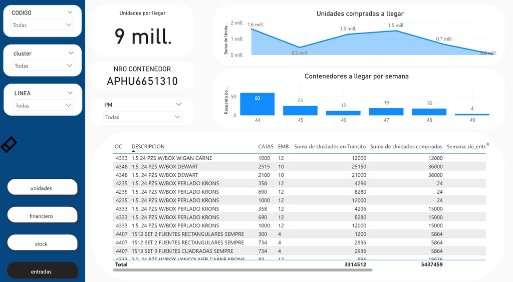 Analisis de la llegada de contenedores al puerto, la idea era estar constantemente informado del stock disponible y sobretodo saber que es lo que tenemos en transito. Este proyecto fue para una empresa de Chile y al no poder vernos fue un gran desafio con mucho aprendizaje.